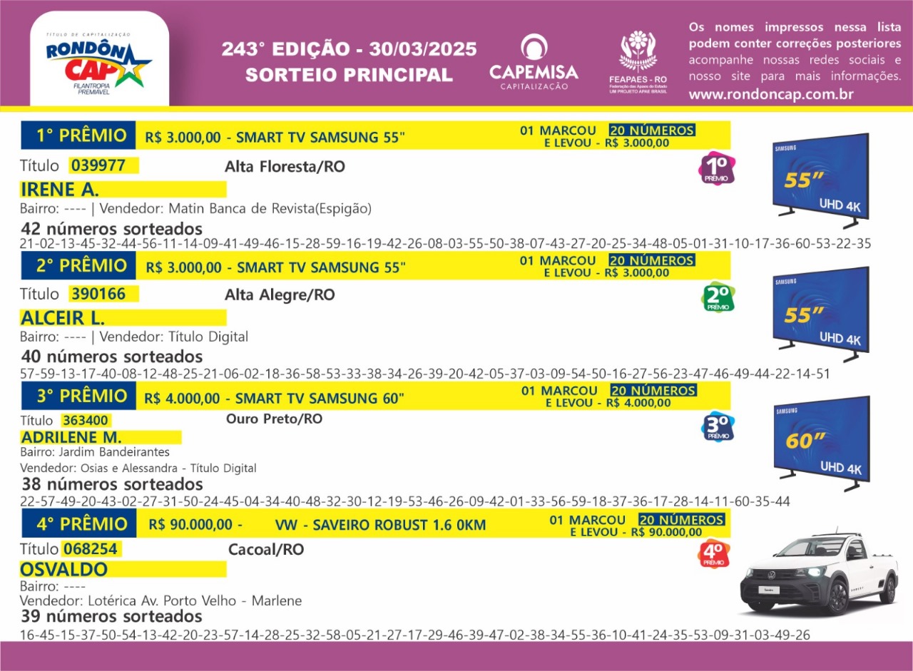 RondonCAP, compre o seu Titulo Fisico ou Digital com o vendedor de sua preferência, ajude as APAES de Rondônia e boa sorte.