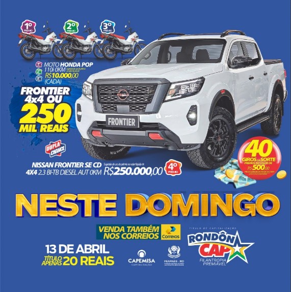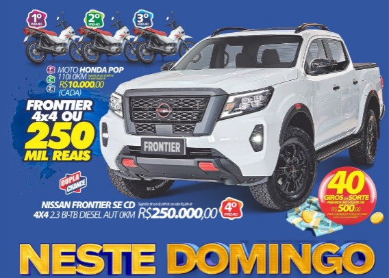 Caminhonete Nissan Frontier de 250 mil, 3 Hondas POP e 40 Giros da Sorte - São 300 mil em prêmios.