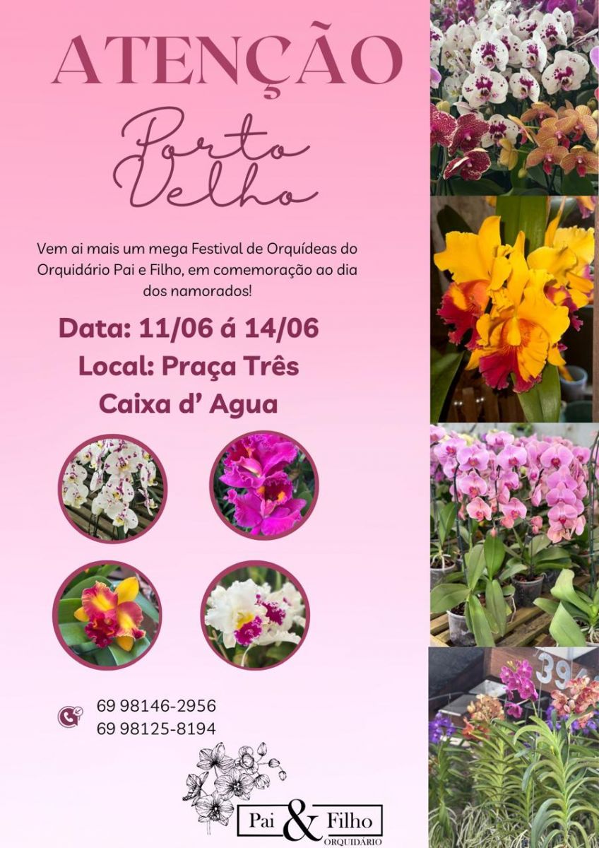 Mega festival de Orquídeas do Orquidário Pai e Filho especial ao dia dos namorados já está acontecendo a partir desta quinta-feira (12) e se estenderá até as 14h de sabado(14) na Praça Três Caixas d’Água, Centro de Porto Velho (RO).