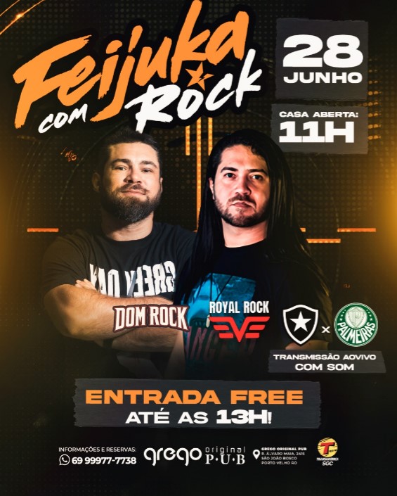 Para você que curte uma balada no fim de tarde, a fejuka com rock é uma excelente opção para o seu sábado. Casa aberta a partir das 11 horas, com delicioso almoço e logo após, a balada mais rock and roll de Porto Velho começa. É uma programação completa, você pode inclusive curtir em família, a casa conta com espaço kids com monitor infantil sem curso adicional nenhum.