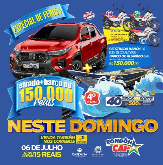 RondonCAP Especial de Férias - Uma Fiat Strada com barco de alumínio no valor de 150 mil, 3 motos Honda POP e 40 Giros.