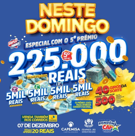 RondonCAP Especial de dezembro, serão no mínimo 45 ganhadores e tem uma bolada de 225 mil reais no 5º Prêmio, 4 prêmios de 5 mil reais e 40 Giros da Sorte!