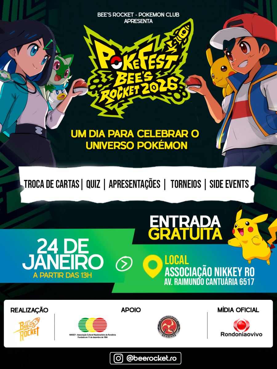 ● 15h15 – Palco Principal (Brincadeiras): Início das gincanas, Poké-Quiz e atividades para o público geral valendo prêmios.