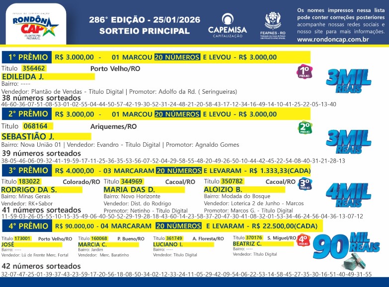 RondonCAP Especial de Aniversário com 100 mil no 4º prêmio e o Título só 5 reais.