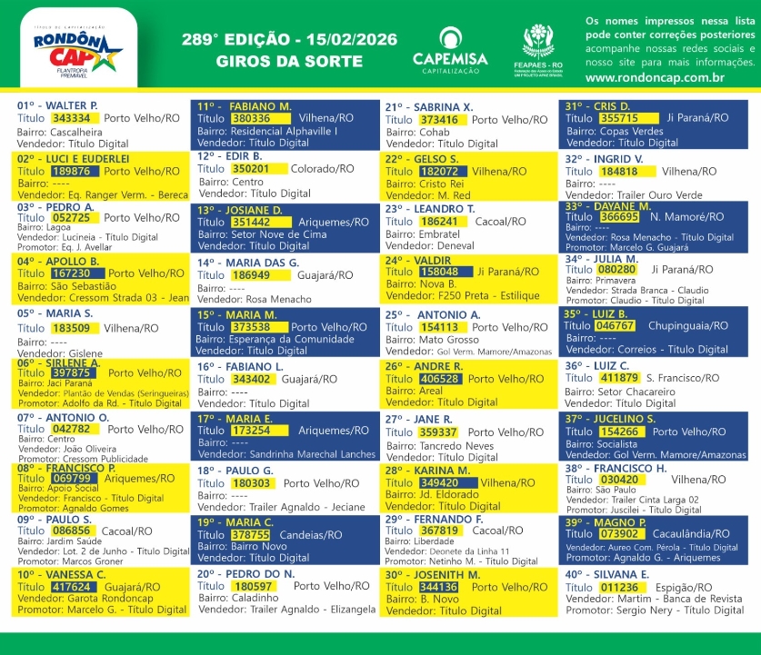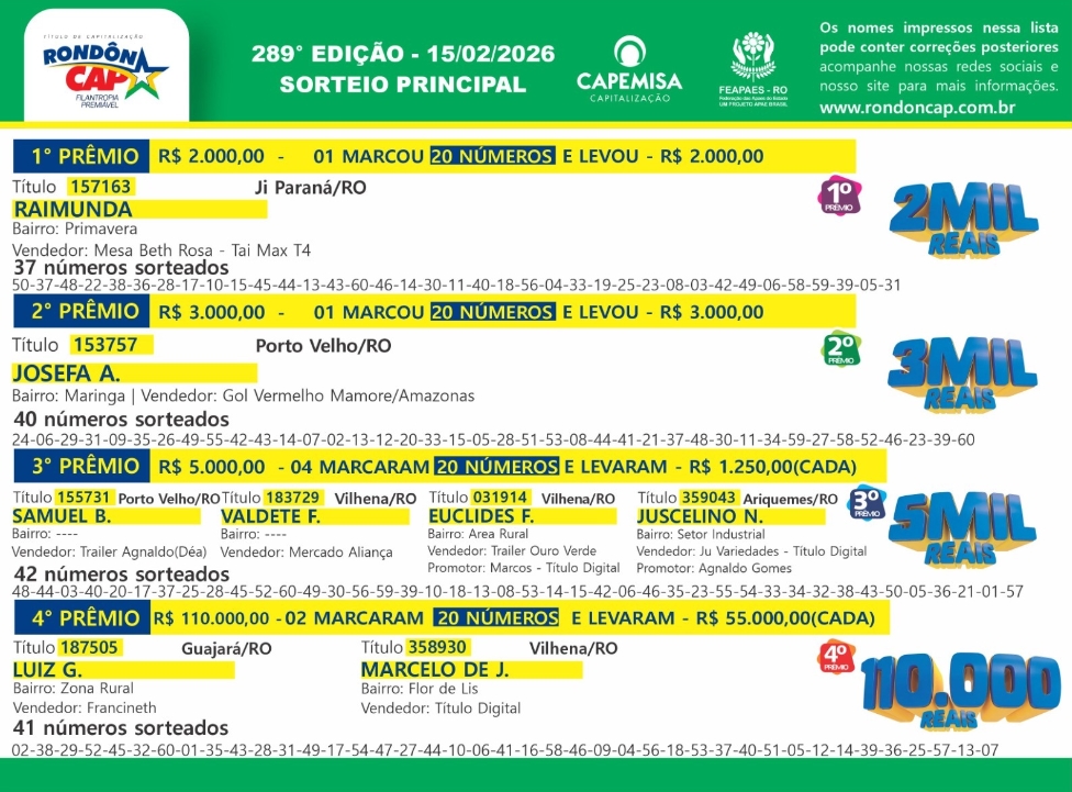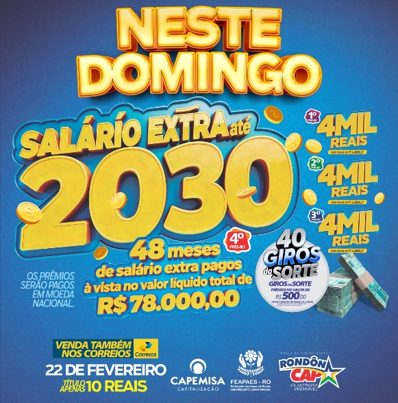 E ainda têm mais 3 prêmios de 4 mil e 40 Giros de 500 reais! RondonCAP, compre o seu por apenas 10 reais!