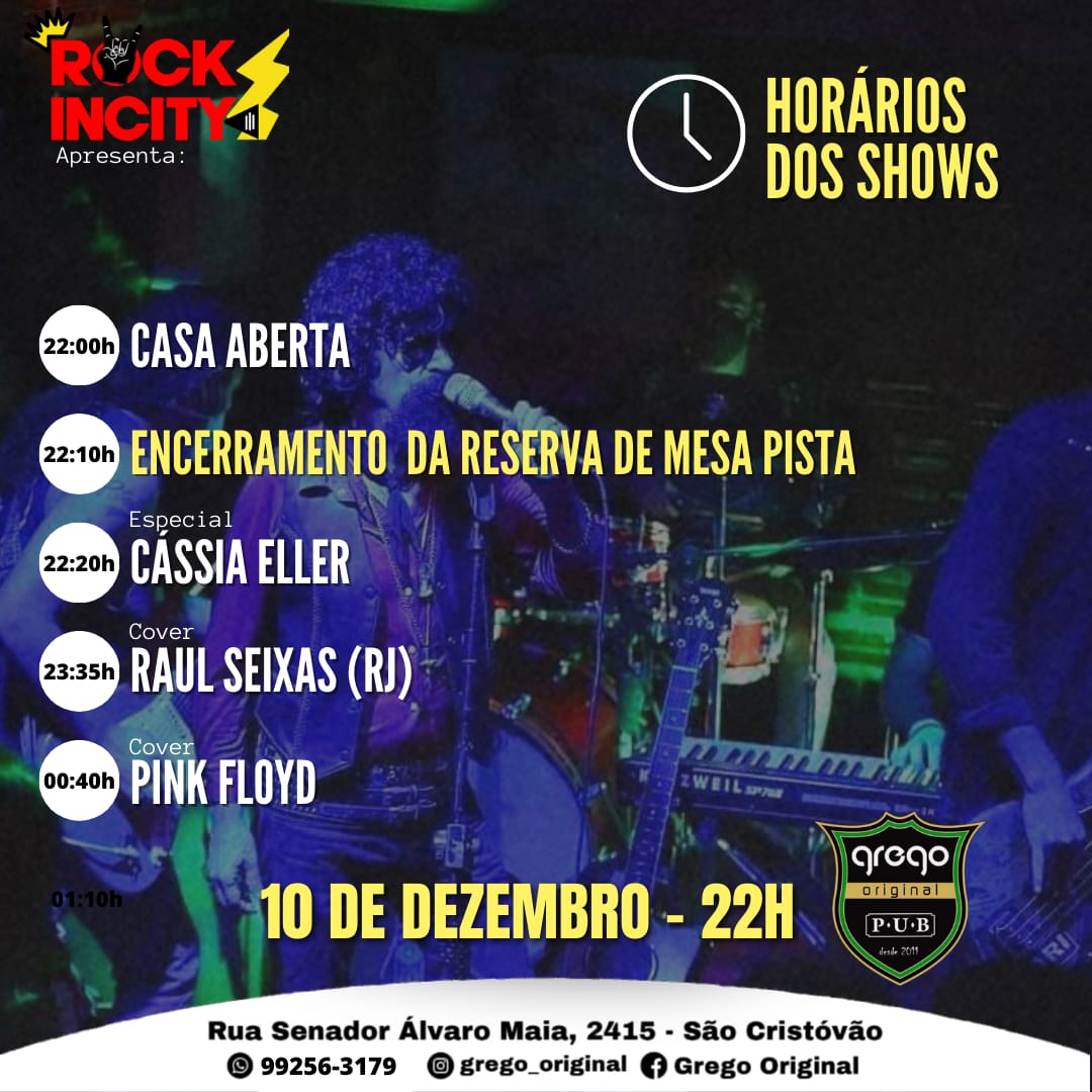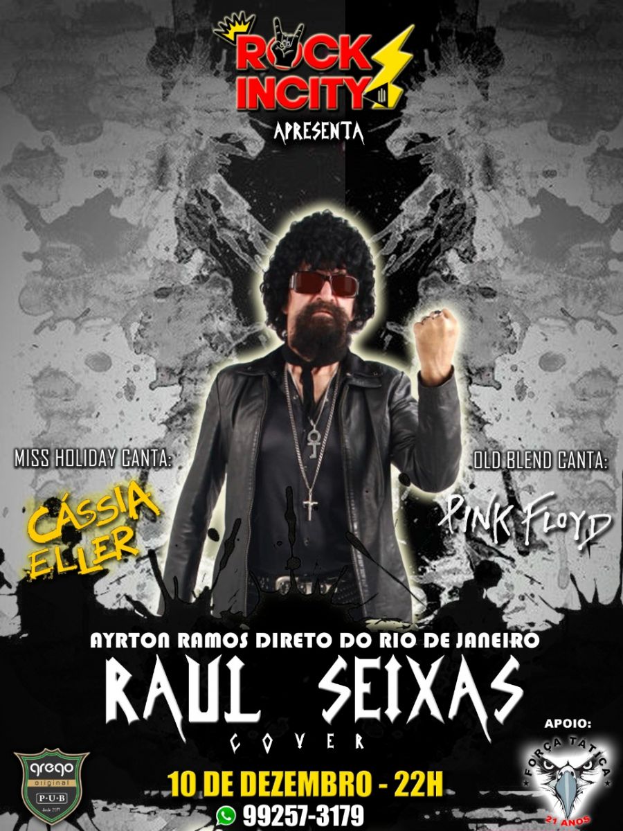 Rock in City apresenta no dia 10 de Dezembro após às 22h no Grego Original Pub, Ayrton Ramos direto do Rio de Janeiro, Cover oficial do Raul Seixas, pré show banda Miss Holiday com especial Cássia Eller e pós show Banda Old Blend com Especial Pink Floyd, evento épico e você não pode ficar de fora.