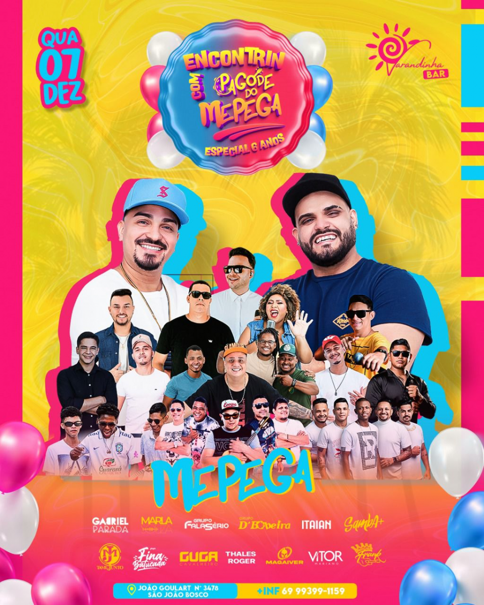 Além do grupo Pagode do MePega também estará presente para animar essa grande festa várias bandas locais, como Gabriel Parada, Marla Souza, Grupo Samba +, Grupo Tamu Junto, Thales Roger, e várias outras.