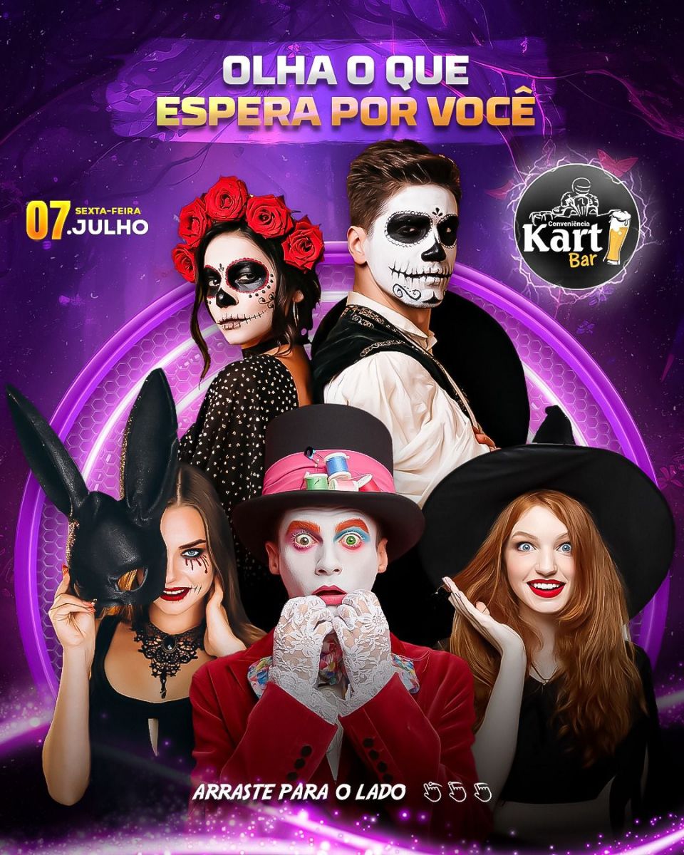 Marque em sua agenda: Kart Fantasy está chegando! No dia 07 de julho, às 21h, prepare-se para uma noite incrível com as melhores atrações e prêmios para as melhores fantasias masculina e feminina.