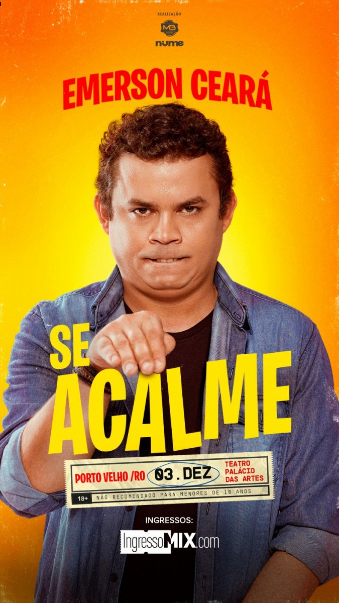 O humorista Emerson Ceará, em seu novo show solo "Se Acalme", explora tudo aquilo que nos irrita: falta de dinheiro, rolês ruins, gente esquisita e muito mais. Por mais que tudo esteja indo de mal a pior, Se Acalme!