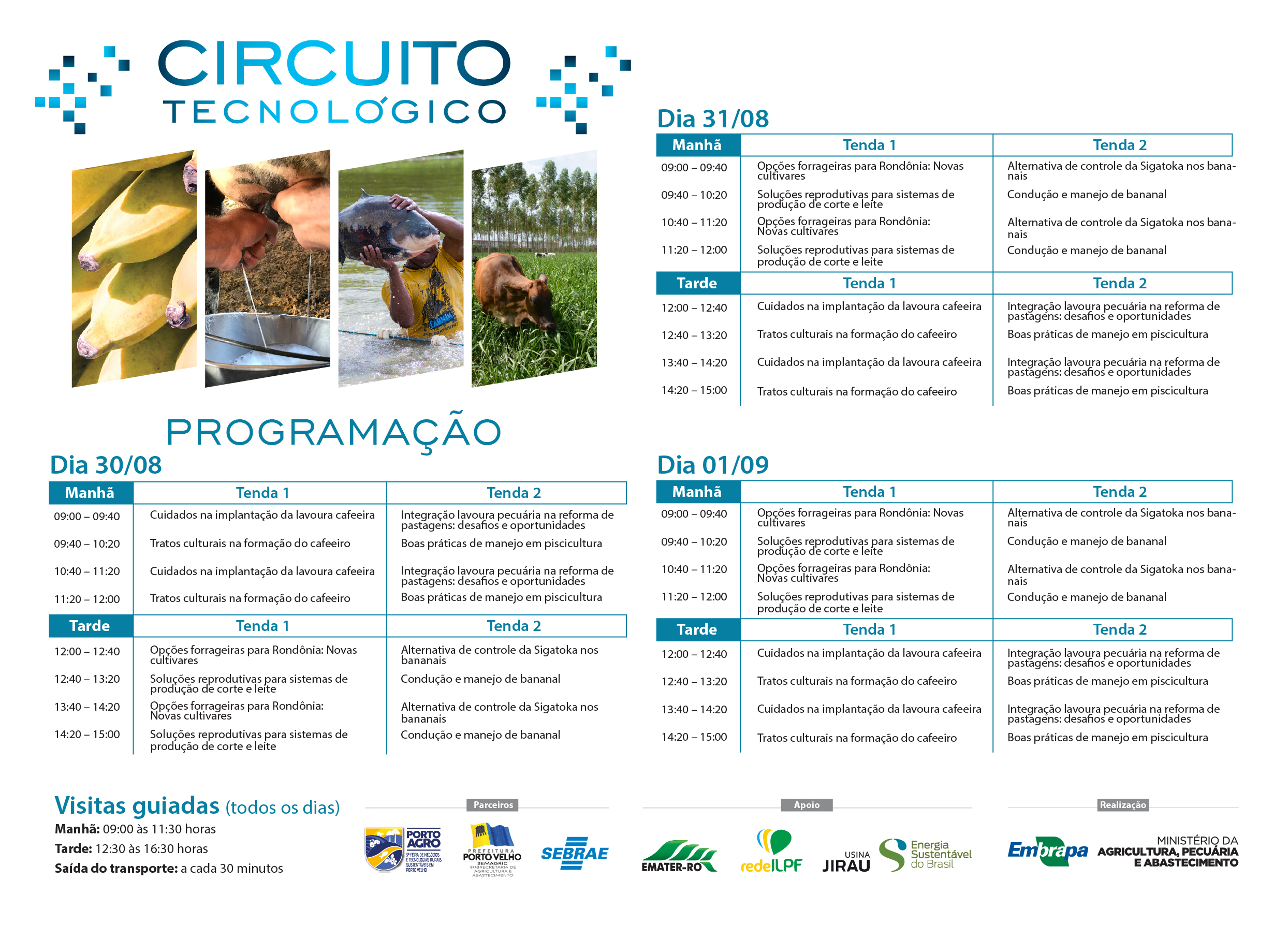 Do dia 30/9 a 1º de setembro as atividades serão em campo, no Circuito Tecnológico. São diversas opções disponíveis para o pequeno, médio e grande produtor. Como destaques, estarão à disposição do público tecnologias recém-lançadas pela Embrapa e sua equipe técnica estará disponível durante toda a feira para sanar dúvidas e promover o intercâmbio de conhecimento.