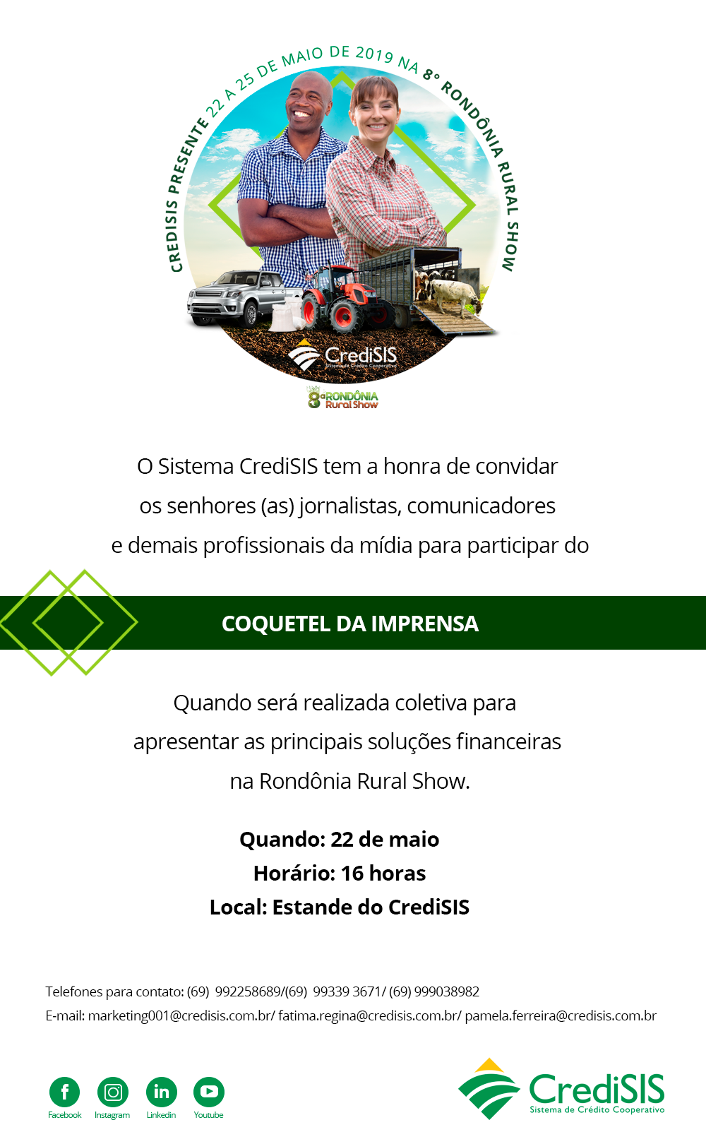 De 22 a 25 de maio, o CrediSIS vai disponibilizar taxas diferenciadas. A feira permite que a consultoria seja mais direcionada às peculiaridades das soluções financeiras, principalmente, às voltadas para o campo.