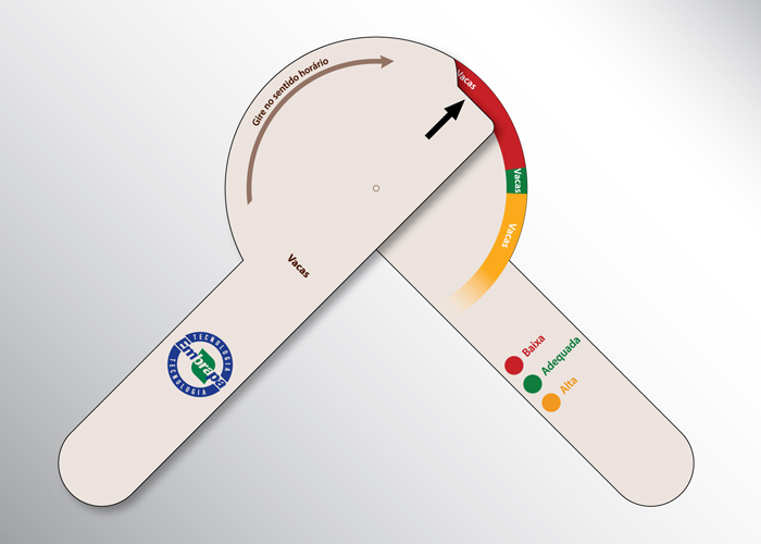 Para avaliar a carcaça, o bovino deve ser contido e o dispositivo deve ser posicionado sobre a garupa, entre a última vértebra lombar e a primeira vértebra sacral, e ser lentamente fechado até que suas réguas estejam em maior contato possível com a pele do animal. A leitura do grau de acabamento é indicada por cores no visor: vermelha, que significa grau de acabamento inadequado e corresponde a carcaças com gordura ausente e escassa; verde, que sinaliza carcaças com grau adequado de acabamento (gordura mediana e uniforme); e amarela, indicativa de grau de acabamento excessivo, ou seja, carcaças com excesso de gordura.