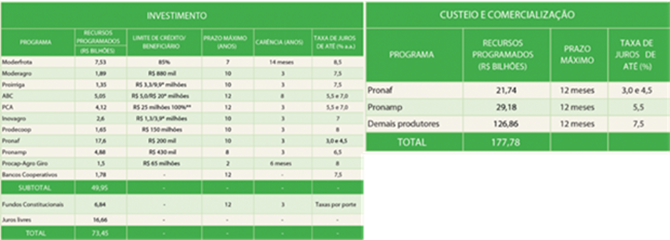 Do total, R$ 177,78 bilhões serão destinados ao custeio e comercialização e R$ 73,4 bilhões serão para investimentos. Os recursos destinados a investimentos tiveram aumento de 29%.