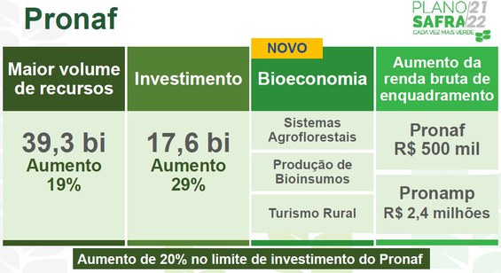 Os recursos para os pequenos produtores rurais tiveram um acréscimo de 19%. Serão destinados R$ 39,34 bilhões para financiamento pelo Programa Nacional de Fortalecimento da Agricultura Familiar (Pronaf), com juros de 3% e 4,5%. Desse valor, R$ 21,74 bilhões são para custeio e comercialização e R$ R$ 17,6 bilhões para investimentos.
