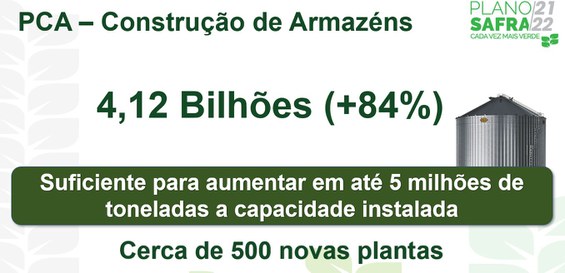 Os recursos para a construção de armazéns nas propriedades também tiveram um aumento significativo. Serão destinados R$ 4,12 bilhões, um acréscimo de 84%. Para o financiamento de armazéns com capacidade de até 6 mil toneladas nas propriedades, a taxa de juros é de 5,5% e para maior capacidade a taxa é de 7% ao ano, com carência de três anos e prazo máximo de 12 anos.