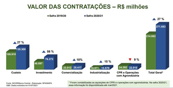 Com o encerramento do Plano Safra 2020/2021 no último dia 30 de junho, produtores rurais e cooperativas de crédito contrataram R$ 271,5 bilhões no crédito rural oficial, aumento de 27% em relação ao período anterior. Nesse montante, foram incluídas as aquisições de Cédula do Produto Rural (CPR) e operações com agroindústria.