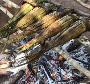 Peixe moqueado na folha de babaçu, na forma tradicional do povo indígena Paiter Suruí