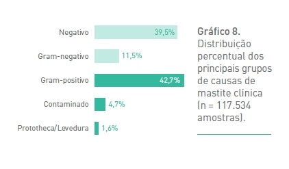 Quando excluídos os casos de mastite clínica grave (7%), o restante (93%) é composto por casos leves e moderados, dos quais os resultados agregados de amostras negativas e de bactérias Gram-negativas totalizaram cerca de 51%.