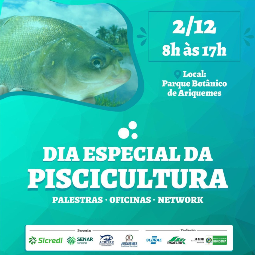 O Dia Especial de Piscicultura em Machadinho do Oeste ocorrerá no próximo dia 30 de novembro, na fazenda do senhor Raul Aradi, e o evento em Ariquemes será realizado no dia 2 de dezembro no Parque Botânico da cidade. Para se inscrever, basta procurar a Emater e o Sebrae locais. Os eventos são fruto de uma parceria entre Sebrae, Acripar, Seagri, Emater, Senar, Sicredi e Prefeitura Municipal de Ariquemes.