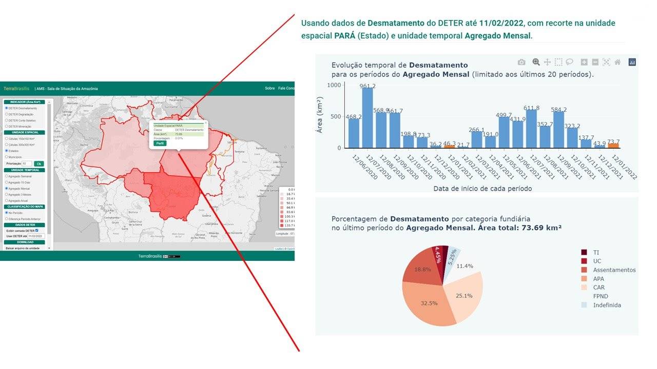 Por exemplo: o usuário pode escolher gerar os dados de desmatamento para o Estado do Pará no último mês. Ao selecionar tais variáveis, ele vai descobrir que, neste período selecionado, o território paraense computou 73,69 km² de desmatamento, sendo que 32,5% dessa destruição da floresta aconteceu em Áreas de Proteção Permanente (APP), 25,1% em áreas com Cadastro Ambiental Rural (CAR), 18,8% em assentamentos, 11,4% em Florestas Públicas, 4,45% em Unidades de Conservação e 5,25% em áreas não definidas.