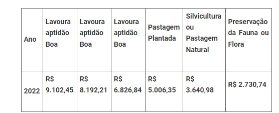Os valores publicados para os imóveis rurais do município de Porto Velho, relativos a 1º de janeiro de 2022, por hectare, podem ser conferidos abaixo: