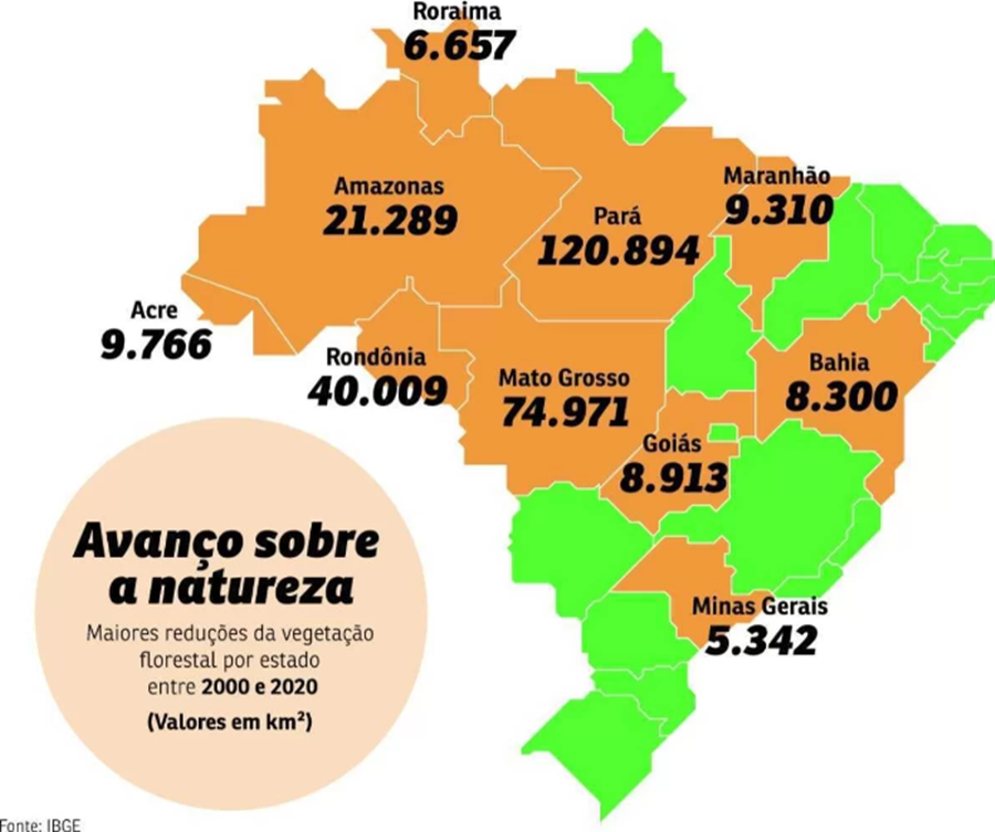 O avanço da fronteira agrícola, somado ao desmatamento dos biomas, fez com que o Brasil perdesse aproximadamente 513 mil km² de áreas nativas nas últimas duas décadas — o equivalente a 6% do território do país ou à soma dos estados de São Paulo, Rio de Janeiro, Paraná e Sergipe. Os dados são da pesquisa Contas Econômicas Ambientais da Terra: Contabilidade Física, divulgada ontem pelo Instituto Brasileiro de Geografia e Estatística (IBGE).