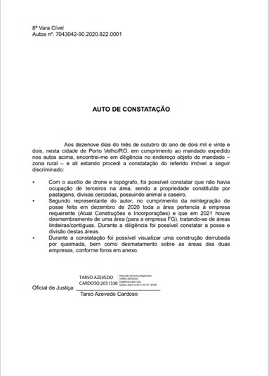 Auto de Constatação por oficial de justiça durante diligência realizada no dia 19 de outubro deste ano