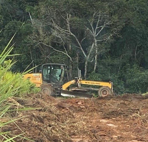 Fotos do flagrante de maquinário público dentro da propriedade para abertura de estrada e desmatamento ilegal realizado pelos invasores