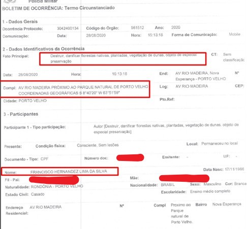 Um boletim de ocorrência de 2020 atesta a prática de crime ambiental na área com o envolvimento de Francisco Hernandez.