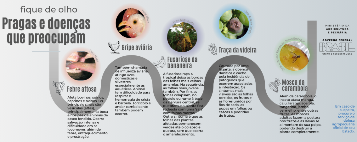 De acordo com normas do Ministério da Agricultura e Pecuária (Mapa), doenças em plantas não são de notificação obrigatória, mas algumas patologias animais sim. É o caso da febre aftosa, influenza aviária, peste suína africana, entre outras. Essas três enfermidades são consideradas ausentes do país, por isso é importante o monitoramento constante para evitar a introdução.