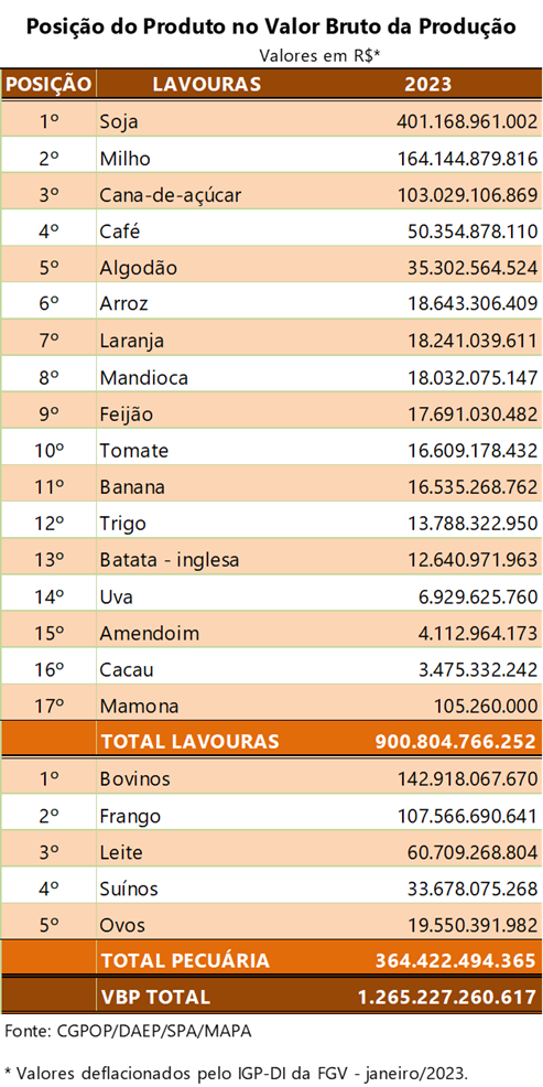 As lavouras de milho e soja são as que mais devem contribuir para esse crescimento, sendo que a soja representa 44,5% do VBP das lavouras, com VBP previsto de R$ 401,0 bilhões. A cana-de-açúcar projeta um crescimento recorde em 2023, o que contribui com o valor total de produção das lavouras neste ano.