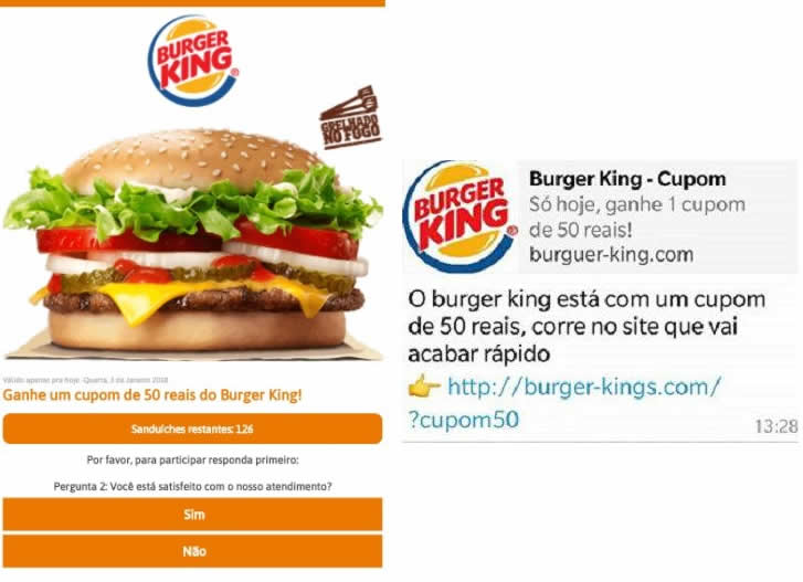 Mal começou 2018 e hackers já estão aplicando golpes agora é um falso cupom no valor de 50 reais para ser gasto na rede de fast food Burger King.