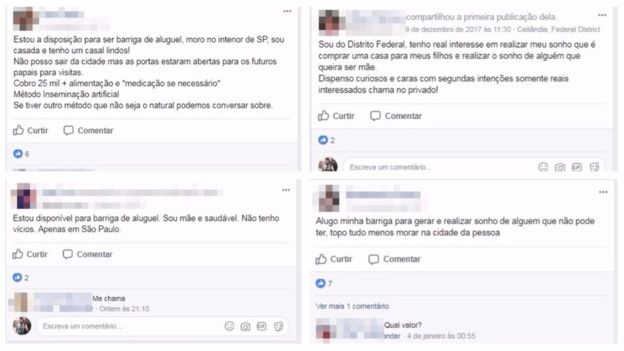 A despeito disso, diversas mulheres se oferecem como barriga de aluguel em páginas e grupos de redes sociais - o maior deles, no Facebook, possui 3,3 mil membros. Cobra-se de R$ 15 mil a mais de R$ 100 mil, além de despesas com a gravidez e estada quando necessário.