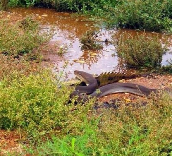 Uma cobra píton oliva (Liasis olivaceus) foi flagrada devorando um crocodilo inteiro em um pântano na região de Queensland, na Austrália. As imagens foram compartilhadas no Facebook pela ONGGG Wildlife Rescue Inc.