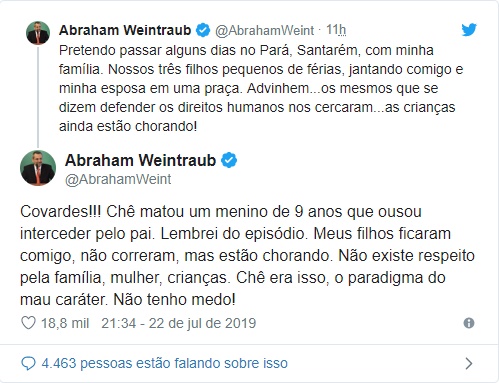 Mais tarde, Weintraub comentou o episódio nas redes sociais. "Pretendo passar alguns dias no Pará, Santarém, com minha família. Nossos três filhos pequenos de férias, jantando comigo e minha esposa em uma praça. Advinhem... os mesmos que se dizem defender os direitos humanos nos cercaram...as crianças ainda estão chorando!", escreveu.