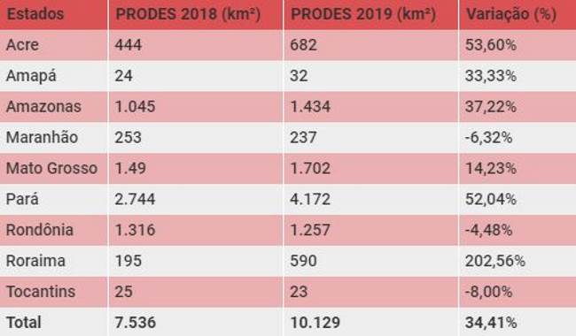 O território desmatado corresponde a um aumento de 34,41% com relação ao período anterior, entre agosto de 2017 e julho de 2018, quando o desmatamento atingiu a marca de 7.536 km².