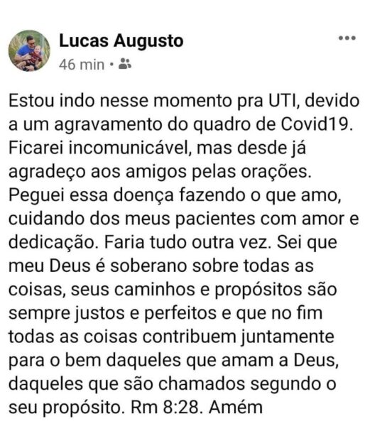 “Estou indo nesse momento para UTI, devido a um agravamento do quadro de COVID-19. Ficarei incomunicável, mas, desde já, agradeço aos amigos pelas orações. Peguei essa doença fazendo o que amo, cuidando dos meus pacientes com amor e dedicação. Faria tudo outra vez. Sei que meu Deus é soberano sobre todas as coisas, seus caminhos e propósitos são sempre justos e perfeitos e que no fim, todas as coisas contribuem juntamente para o bem daqueles que amam a Deus, daqueles que são chamados segundo seu propósito”.