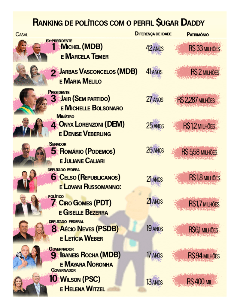 Sugar Daddy – termo em inglês, formado pela junção das palavras “açúcar” e “papai”, é utilizado para denominar homens mais velhos que bancam despesas de mulheres mais jovens como retribuição do que se define em linhas gerais pelos sites especializados de “relacionamento Sugar”. Assim como no mundo dos famosos, casais com grande diferença de idade também são comuns na cena política brasileira. A rede social Universo Sugar fez um ranking dos 10 políticos que, assim como os sugar daddies, se relacionam com mulheres mais jovens. Presidente Jair Bolsonaro (sem partido), governador do Rio Wilson Witzel (PSC-RJ) e senador Romário (Podemos-RJ), são alguns que figuram a lista.