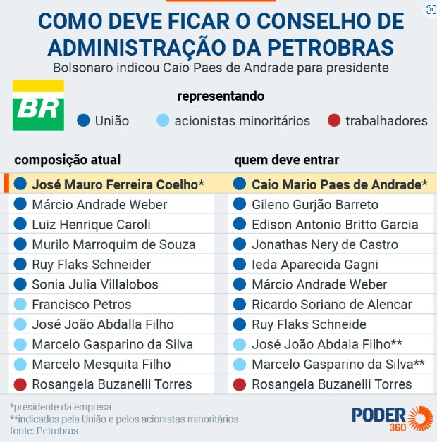 O governo Bolsonaro já indicou novos nomes para o Conselho da Petrobras. A indicação de Caio Paes de Andrade, atual secretário especial de Desburocratização, Gestão e Governo Digital do Ministério da Economia, foi confirmada pelo Ministério de Minas e Energia em 9 de junho. Para ele assumir, no entanto, é necessária uma assembleia do Conselho de Administração.