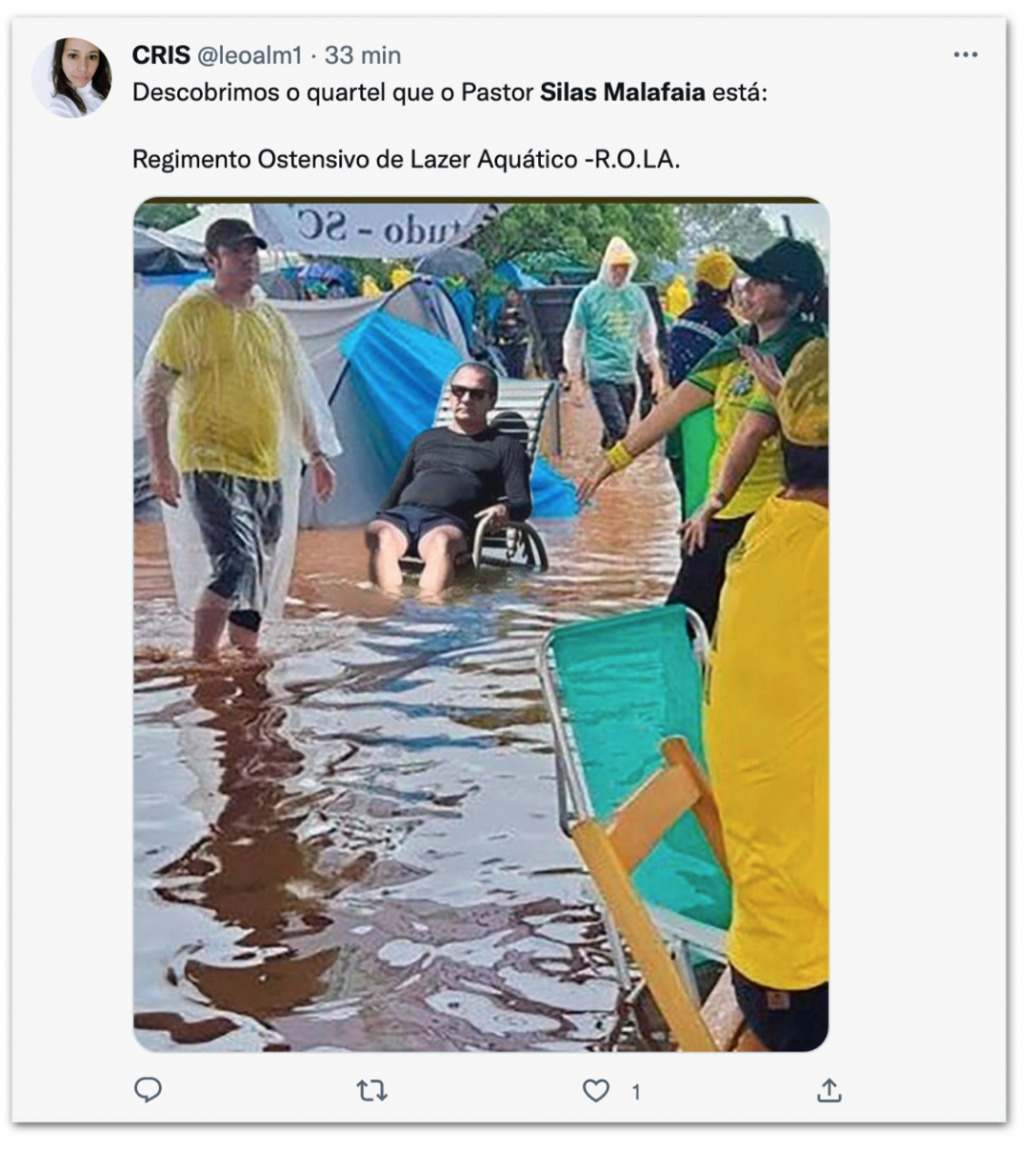 “Descobrimos o quartel que o Pastor Silas Malafaia está: Regimento Ostensivo Lazer Aquático -R.O.L.A.”, publicou uma mulher com uma montagem do líder religioso.