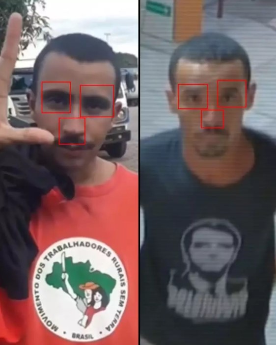Comparativo entre o integrante do MST (à esq.) com o vândalo (à dir.) que destruiu relógio secular em Brasília.