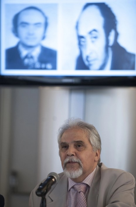 Delegado Aparecido Laertes Calandra em audiência da Comissão Nacional da Verdade, em 2014, sobre imagens de Vladimir Herzog, torturado e morto em 1975 | Foto: Marcelo Camargo/Agência Brasil