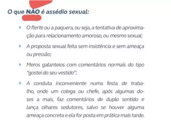 Segundo o texto, a proposta sexual também é permitida, desde que "seja feita sem insistência, e sem ameaça ou pressão". A indicação é contrária à própria legislação trabalhista que afirma que, especialmente em casos que envolvem hierarquia superior, qualquer conduta sexual é considerada assédio sexual.