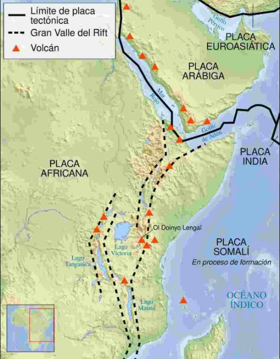 A olho nu já é possível observar o deslocamento de uma pequena parte da África, denominada pelos especialistas como Placa da Somália, da parte que corresponde a uma maior extensão, chamada Placa da Somália. A abertura no ponto visível da terra e a própria separação do continente se dá por meio da ascensão de jorros de magma do interior do planeta, que causam um afinamento da crosta terrestre até resultar no rompimento.