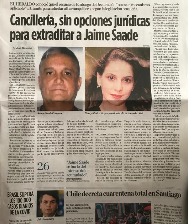 O tribunal marcou para o dia 29 de março o julgamento de um pedido para rever decisão de 2021 que impediu a extradição para a Colômbia de Jaime Saade, condenado em seu país a 27 anos de prisão pelo homicídio de Nancy Mestre em 1996, quando ela tinha apenas 18 anos.