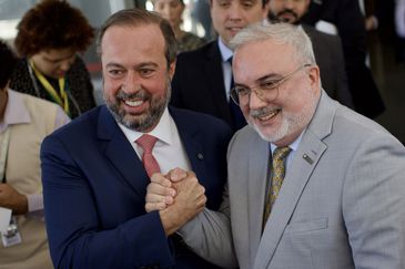 Presidente da Petrobras, Jean Paul Prates, ao lado do ministro de Minas e Energia, Alexandre Silveira, defende 'abrasileirar' preços e anuncia redução no valor dos combustíveis, em entrevista coletiva em Brasília. Foto: Fábio Rodrigues-Pozzebom/Agência Brasil
