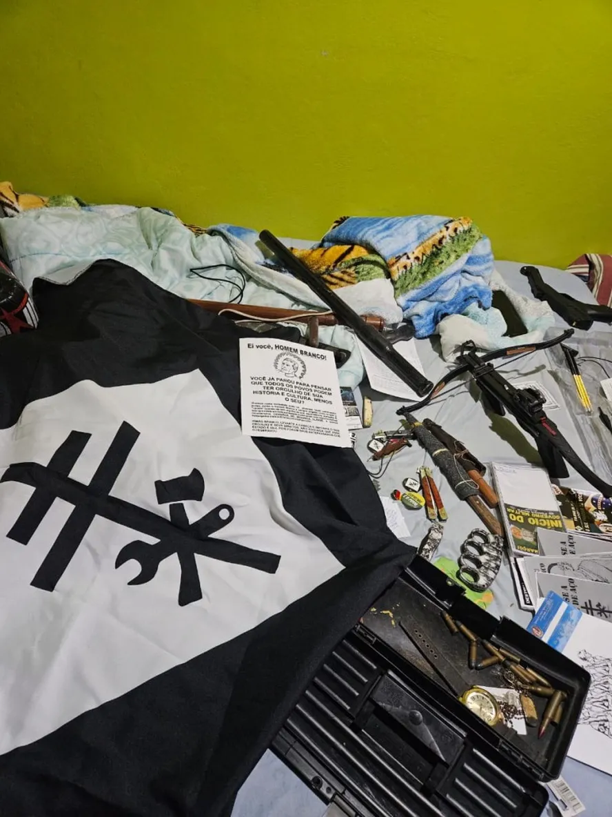 FOTO: Material de grupo neonazista e supremacista apreendido em operação da Polícia Civil do RS feita em parceria com a Abin — Foto: Reprodução/ Polícia Civil do RS