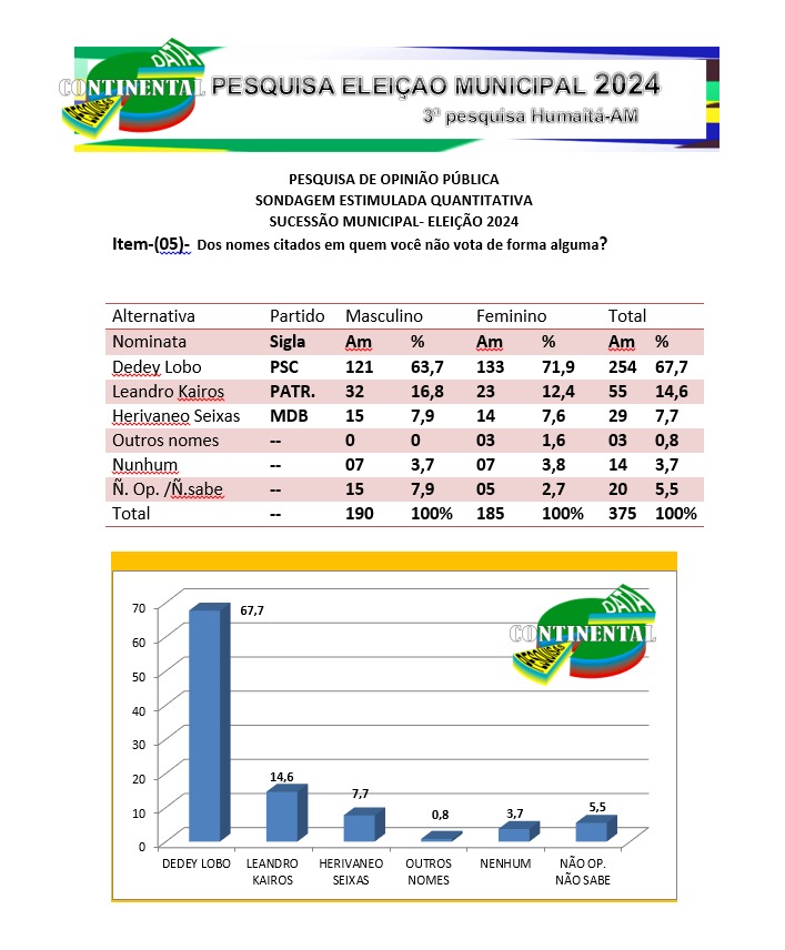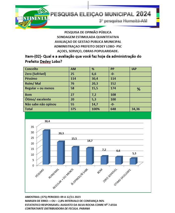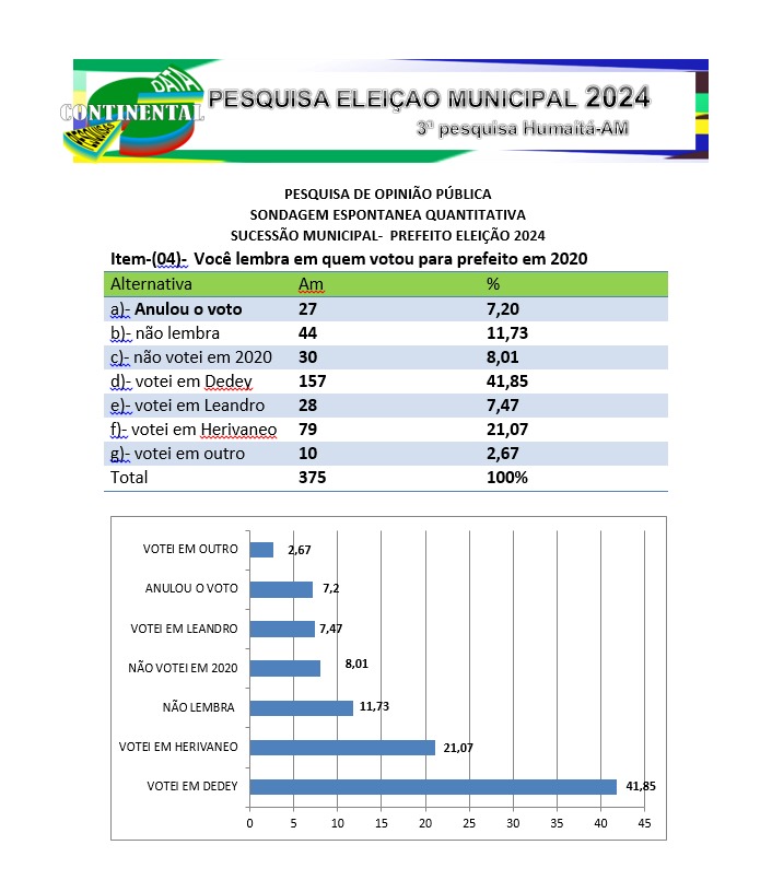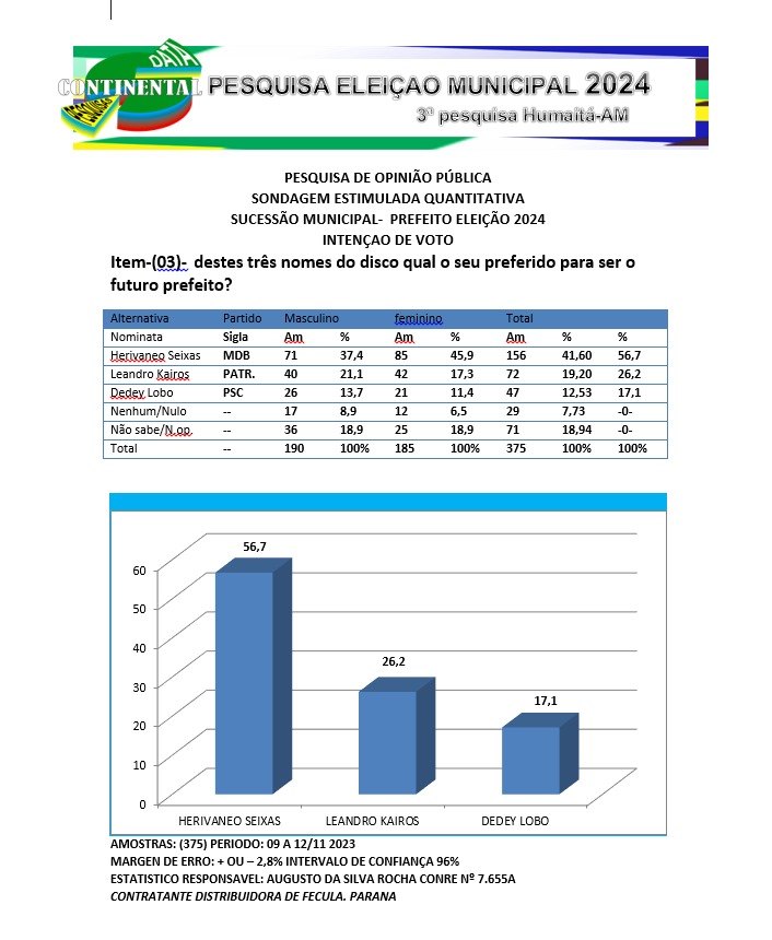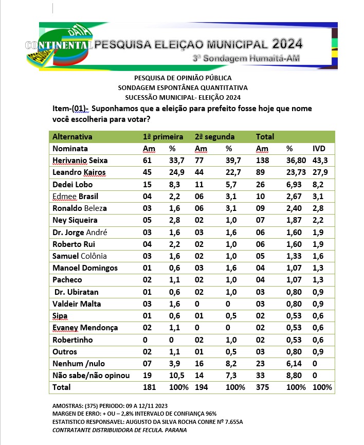 O Instituto de Pesquisa Data Continental divulgou os resultados da 3ª pesquisa eleitoral municipal realizada em Humaitá-AM entre os dias 09 a 12 de novembro de 2023. A pesquisa teve como objetivo avaliar o cenário político e as intenções de voto para a eleição municipal de 2024. Confira os principais resultados:
