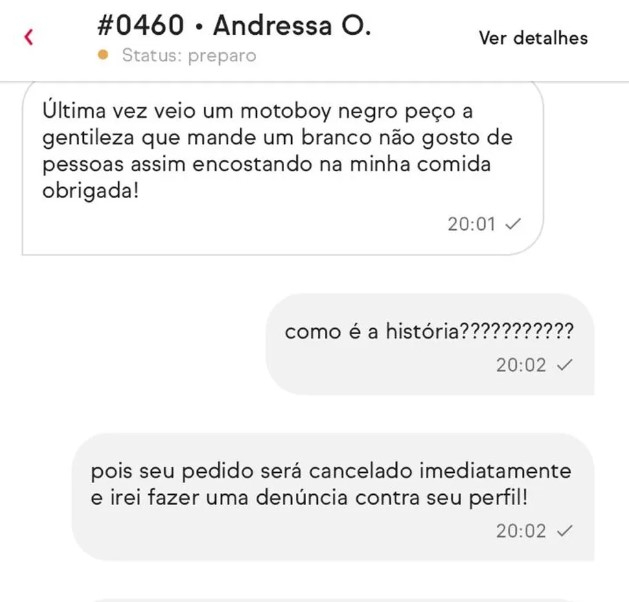 A consumidora solicitou, nas observações do aplicativo, que a loja enviasse "um motoboy branco" porque não gostava de pessoas negras "encostando" em sua comida.