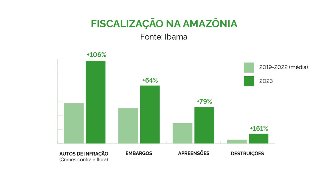De janeiro a dezembro de 2023, o Ibama aumentou os autos de infração por crimes contra a flora em 106% na comparação com a média de 2019 a 2022. A destruição de bens e os embargos cresceram 161% e 64%, respectivamente, no mesmo período. Já as apreensões aumentaram 79%.